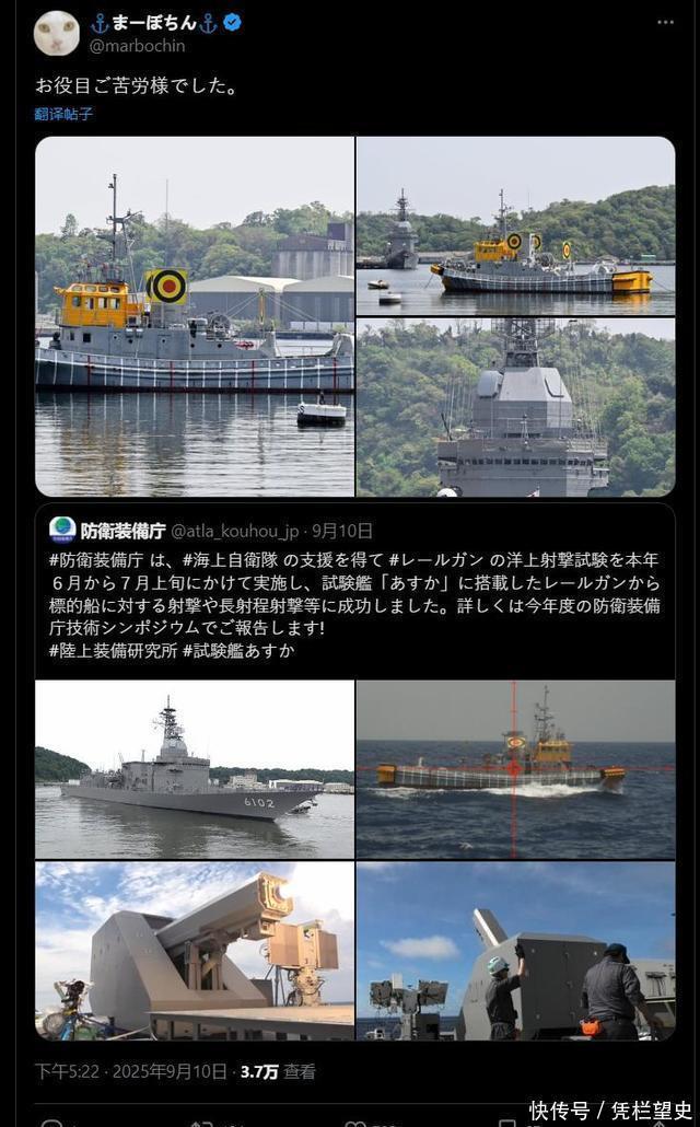 2025年9月,日本防卫省通过社交媒体宣布,其海上自卫队“飞鸟”号试验舰在6月至7月间 成功完成舰载电磁炮对真实舰船目标的实弹射击。 这一消息经美国媒体报道后,被迅速贴上“海战规则改变者”的标签,更有声音宣称 日本已在该领域超越中国。 日本高调展示的舰载打击能力是为何?所谓的“规则改变”又是否言之过早? 日本电磁炮 日本此次测试的电磁炮系统,被安装在6200吨级的“飞鸟”号试验舰尾部甲板上。 从公开的照片可以看到,这门电磁炮全长约6米,口径40毫米,炮塔旁不仅有复杂的电缆连接,还配套了白色集装箱式的电源设备和独立的雷达、光电探测装置。
